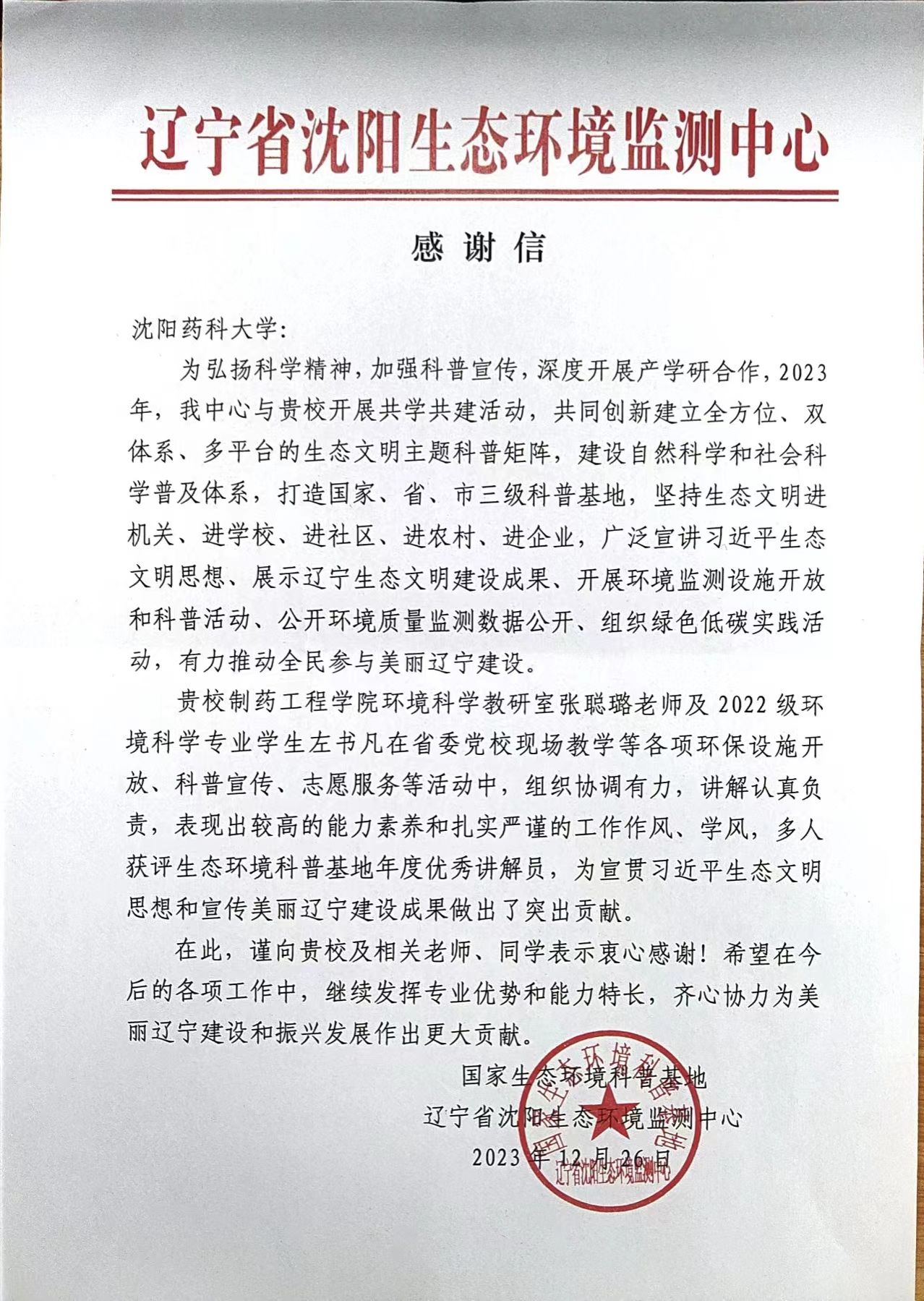 近日,beat365平台唯一官网收到一封来自辽宁省沈阳生态环境监测中心的感谢信。信中对beat365环境科学教研室张聪璐老师及2021级环境科学专业学生左书凡,在省委党校现场教学等各项环保设施开放、科普宣传、志愿服务等活动中的能力素养、工作作风和学风给予高度肯定和赞扬,对beat365志愿者表示了由衷的感谢和诚挚的敬意。