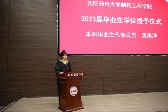 86期制药工程专业毕业生吴帛洋、2020级药物化学专业毕业生杨晶同学分别代表毕业本科生和研究生发言。两位同学深情表达了对母校的感谢之意、对师长的感恩之心、对同学的不舍之情,呼吁同学们发挥青年人的朝气和锐气,踔厉奋发,笃行不怠,不负青春,不负韶华,肩负起兴药报国的使命,力争做出更多更好的成绩以回报母校的培养,把追梦的青春播撒在中华民族伟大复兴的事业里,让多彩的理想盛放在不忘初心砥砺前行的奋斗中。
