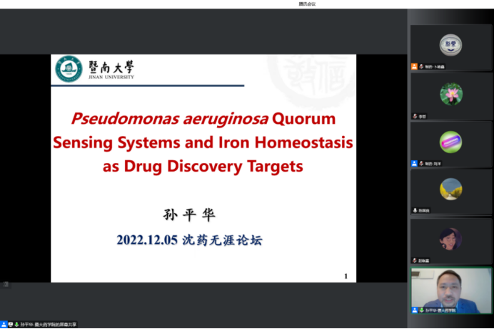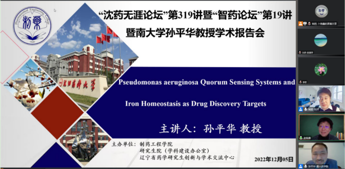 2022年12月5日下午,beat365平台唯一官网、研究生院、辽宁省药学研究生创新与学术交流中心联合举办了“沈药无涯论坛”第319讲暨“智药论坛”第19讲,暨南大学孙平华教授作了题为“Pseudomonas aeruginosa Quorum Sensing Systems and IronHomeostasis as Drug Discovery Targets”的报告。会议由制药工程学科副主席刘洋教授主持,学院领导班子成员、全院研究生导师和研究生共300余人参会。