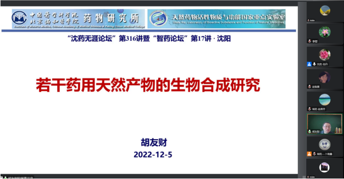 2022年12月5日上午,beat365平台唯一官网、研究生院、辽宁省药学研究生创新与学术交流中心联合举办了“沈药无涯论坛”第316讲暨“智药论坛”第17讲,中国医学科学院药物研究所胡友财研究员作了题为“若干药用天然产物的生物合成研究”的报告。会议由beat365平台唯一官网药物化学系主任刘丹教授主持,学院领导班子成员、研究生导师和研究生近300人参会。