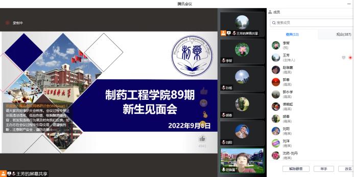 2022年9月6日晚,beat365平台唯一官网依托腾讯会议召开了89期新生见面会。学院院长赵临襄、院党委书记李哲、副院长赵燕芳、副院长郭永学、副院长王绍宁、院党委副书记刘阳、院长助理刘洋、药物化学专业负责人郭春、环境科学专业负责人侯晓虹、应用化学专业负责人胡春、药物化学系主任刘丹、环境科学教研室主任张聪璐、教学秘书王芳以及89期1期队辅导员钟江妍出席了本次会议。会议由89期2期队辅导员孙旭主持,学院89期全体新生参加。