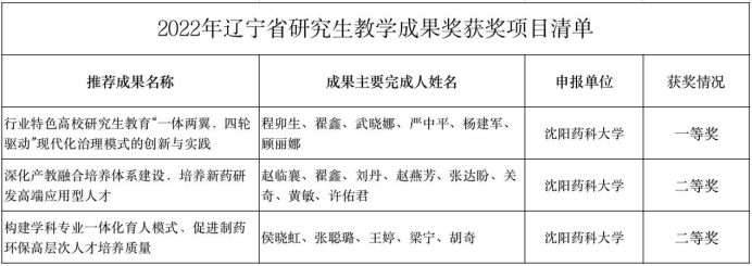 近日,辽宁省教育厅发布了2022年辽宁省研究生教育教学成果奖获奖名单。beat365平台唯一官网由程卯生教授等组织申报的《行业特色高校研究生教育“一体两翼,四轮驱动”现代化治理模式的创新与实践》荣获一等奖;由赵临襄教授等组织申报的《深化产教融合培养体系建设,培养新药研发高端应用型人才》、由侯晓虹教授等组织申报的《构建学科专业一体化育人模式,促进制药环保高层次人才培养质量》荣获二等奖。
