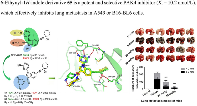 beat365平台唯一官网程卯生教授团队在X射线结晶学和结构优化的指导下,通过对先导化合物进行多轮结构优化,得到了一系列3-取代-6-取代乙炔基-1H-吲哚类化合物。作为II类PAKs抑制剂,该系列化合物对PAK4蛋白激酶具有显著的抑制活性和特异性。其中,化合物55对肺癌细胞株A549和黑色素瘤细胞株B16在2.5μM浓度下的迁移抑制率大于40%和60%,优于阳性对照GNE-2861,表现出优异的抗迁移和抗侵袭性能;体内药动实验表明,化合物55在小鼠体内具有适中的半衰期与代谢速率;在裸鼠A549和B16-BL6移植瘤肺转移模型中,化合物55对肺表面转移结节的抑制率分别超过80%和90%。机制研究表明,化合物55减轻转化生长因子-β1诱导的上皮-间充质转化,能够有效抑制肿瘤的迁移、侵袭及转移行为。