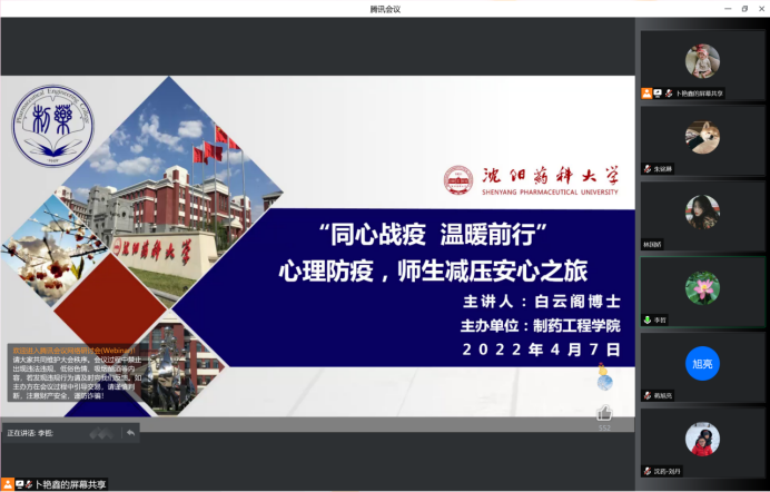 为深入贯彻落实学校疫情防控工作领导小组关于加强心理疏导工作的部署要求,强化疫情防控期间beat365全体师生心理健康工作,不断加强研究生心理健康教育和疏导,提高学生在疫情防控期间心理健康自助、互助能力,全面保障学习生活平稳有序进行。4月7日,beat365平台唯一官网举办了主题为“同心战疫 温暖前行”———心理防疫,师生减压安心之旅心理健康讲座,邀请辽宁省心理特级教师白云阁博士开展线上心理健康讲座,全院500余师生参加了此次心理健康讲座,会议由beat365平台唯一官网党委书记李哲主持。