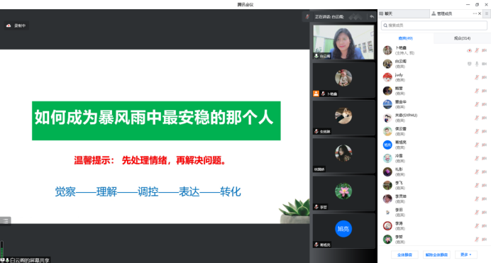 白老师的讲座围绕疫情期间师生常见压力反应、压力情绪管理清单、师生自我心理关怀三个方面展开。通过介绍丰富的心理学理论知识,结合具体案例,贴近实际,用优美、亲切的语言为我们讲述了生活、工作、学习中常见的压力反应。并给出当面对这些普遍存在的一些心理困惑,如情绪情感问题、人际关系、就业择业等方面压力问题时该如何应对。同时,白老师讲述了因疫情发展所带来的新问题与挑战,分析了产生不良负面情绪和心理压力的原因,为师生提出了有效的压力管理技能清单。最后,引导与会师生“如何成为暴风雨中最安稳的那个人”。