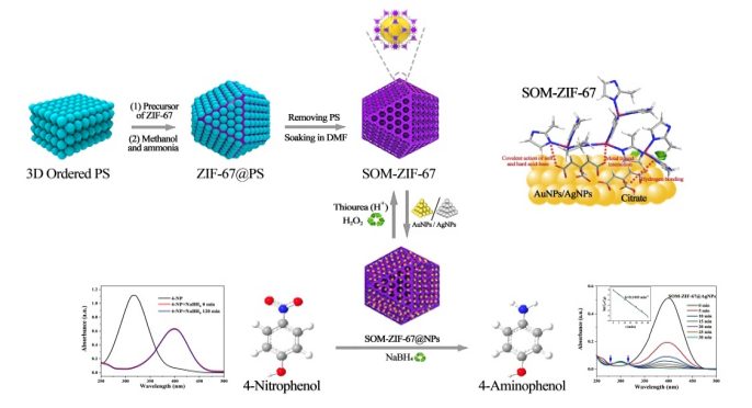 课题组还以NaBH4还原4-硝基苯酚的反应为模型,对SOM-ZIF-67吸附AgNPs/AuNPs前后材料的催化性能进行了研究,发现SOM-ZIF-67与贵金属纳米粒子可以协同增强催化效果,只需较低的活化能即可实现对4-硝基苯酚的优异催化性能,进而实现复合材料的二次利用,体现了绿色可持续发展理念。另外,由于该反应主要涉及加氢还原的电子转移,因此SOM-ZIF-67@AgNPs/AuNPs复合催化剂可进一步用于类似的化学反应,具有广泛的工业应用价值。
