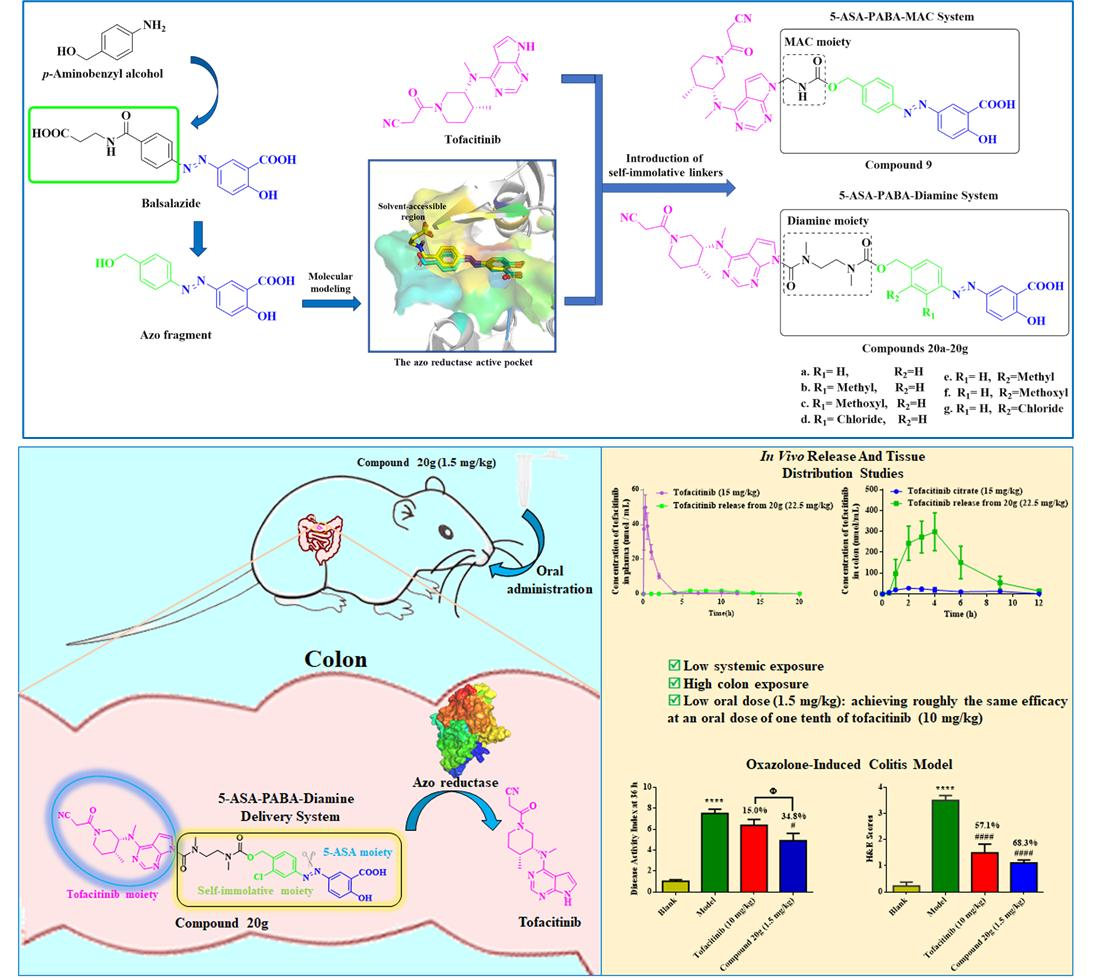 日前,药物化学权威期刊《Journal of Medicinal Chemistry》(IF = 7.446)发表了beat365王绍杰教授课题组在结肠靶向释放系统治疗溃疡性结肠炎领域的最新研究成果。论文题目为“Discovery of a Colon-Targeted Azo Prodrug of Tofacitinib through the Establishment of Colon-Specific Delivery Systems Constructed by 5‑ASA−PABA−MAC and 5‑ASA−PABA−Diamine for the Treatment of Ulcerative Colitis”。