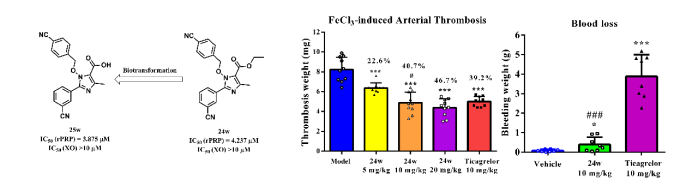 课题组前期报道了非嘌呤类黄嘌呤氧化酶抑制剂WSJ-557,在其动物体内评价过程中,意外发现其具有明显的抗血小板作用。然后以WSJ-557作为先导化合物,对其进行了结构优化得到了2-苯基-1H-咪唑类衍生物。其中,化合物24w和25w均具有较好的体外ADP诱导的抗血小板活性。药动学评价显示,大鼠口服化合物24w或25w后起效快,其Tmax分别为0.46和0.167 h。体内药效学研究表明,化合物24w口服剂量10 mg/kg下与替格瑞洛抗血栓药效相当,且出血风险显著降低,其出血时长和出血重量分别降低了3.54和9.73倍。结果表明,化合物24w具有更宽的治疗窗,安全性更高,可以作为治疗动脉血栓形成及相关疾病的潜在候选药物。