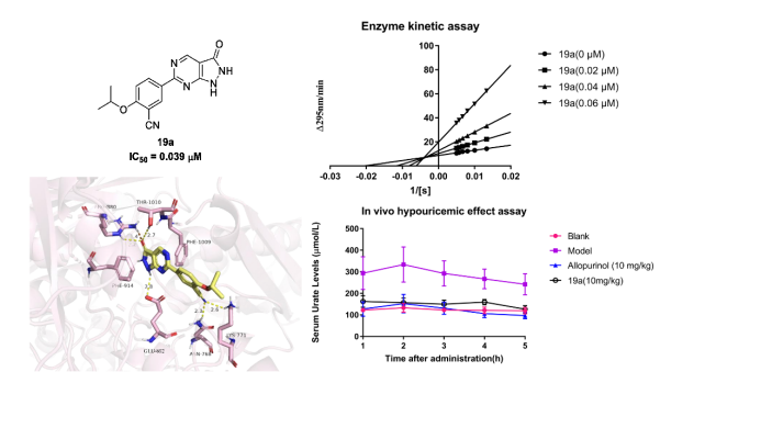 课题组前期研究发现嘧啶类XO抑制剂具较大的潜力,采用FBDD策略设计了一系列吲哚-嘧啶衍生物,其中化合物13g和25c展现出了较好的体外活性,IC50值分别为0.16μM和0.085μM,均在10mg/kg剂量下显著降低大鼠血清尿酸水平,具有后续研究的潜力。另一方面,在嘧啶类XO抑制剂TMC-5的基础上,通过破坏分子内氢键和基于分子内氢键的骨架跃迁这两种策略,分别设计了嘧啶羧酸系列和嘧啶并吡唑酮系列化合物,其中优选化合物15a和19a表现出显著的体外和体内活性,为XO抑制剂的研究提供了新思路。