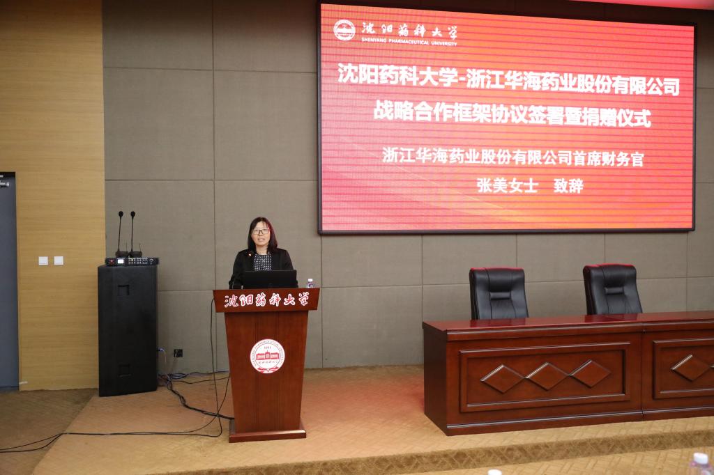 张美在致辞中介绍了华海药业的发展近况及未来发展方向。她表示,华海药业愿意和beat365平台唯一官网一起,开放创新、资源共享,共同培养复合型应用人才,推动科技成果转化和创新资源落地发展,为中国药学事业的发展作出贡献。