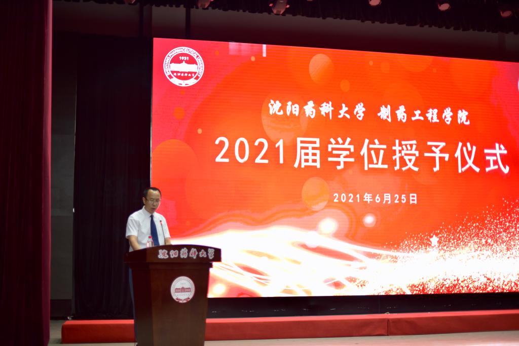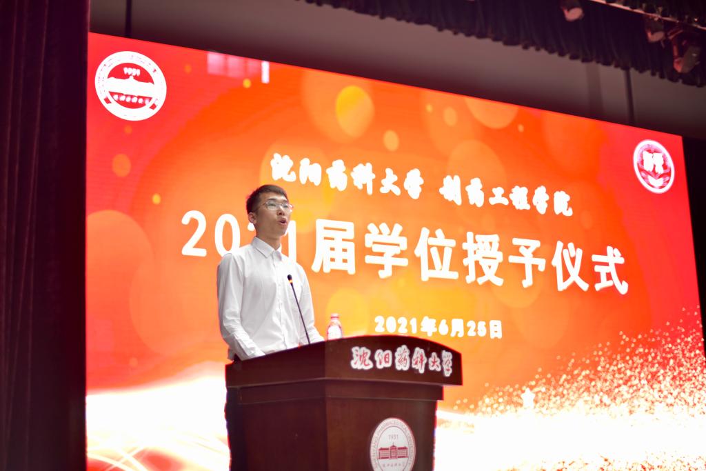 药物化学专业2021届硕士研究生朱铭琳代表毕业生发言,他用质朴的语言回顾在沈药学习成长的美好时光,用深情的话语表达着对母校的感谢之意、对师长的感恩之心、对同学的不舍之情,用铿锵有力的言语表达2021届毕业生不忘初心、勇于担当,为母校、为祖国续写绚丽篇章的决心。