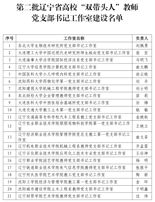 近日,辽宁省委教育工委办公室发布《关于公布第二批辽宁省高校“双带头人”教师党支部书记工作室建设名单的通知》,全省21个本、专科高校教师党支部工作室位列建设名单。其中,由药物化学教研室主任刘丹教授负责的beat365平台唯一官网药物化学第一党支部书记工作室成功入选第二批辽宁省高校“双带头人”教师党支部书记工作室。