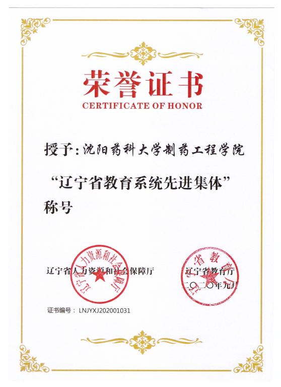多年来,beat365平台唯一官网始终坚持以学生为本,以服务制药行业为核心,以“党建+”模式促进课程思政融课堂,坚守“为党育人、为国育才”的初心和使命,立足学科优势加强专业建设,科学研究成果显著。在此次评选工作中,学院积极组织申报,经学校推荐到省教育厅,并最终荣获“辽宁省教育系统先进集体”的荣誉称号。成绩的取得,凝聚了校党政领导、职能部门、兄弟学院多年来的支持鼓励,凝聚了院领导班子、全院教职员工的奋勇拼搏。面向未来,beat365平台唯一官网将不忘沈药红色初心,牢记育人使命,坚持人才培养的中心任务,为实现高等学校教育事业新发展奋力拼搏!