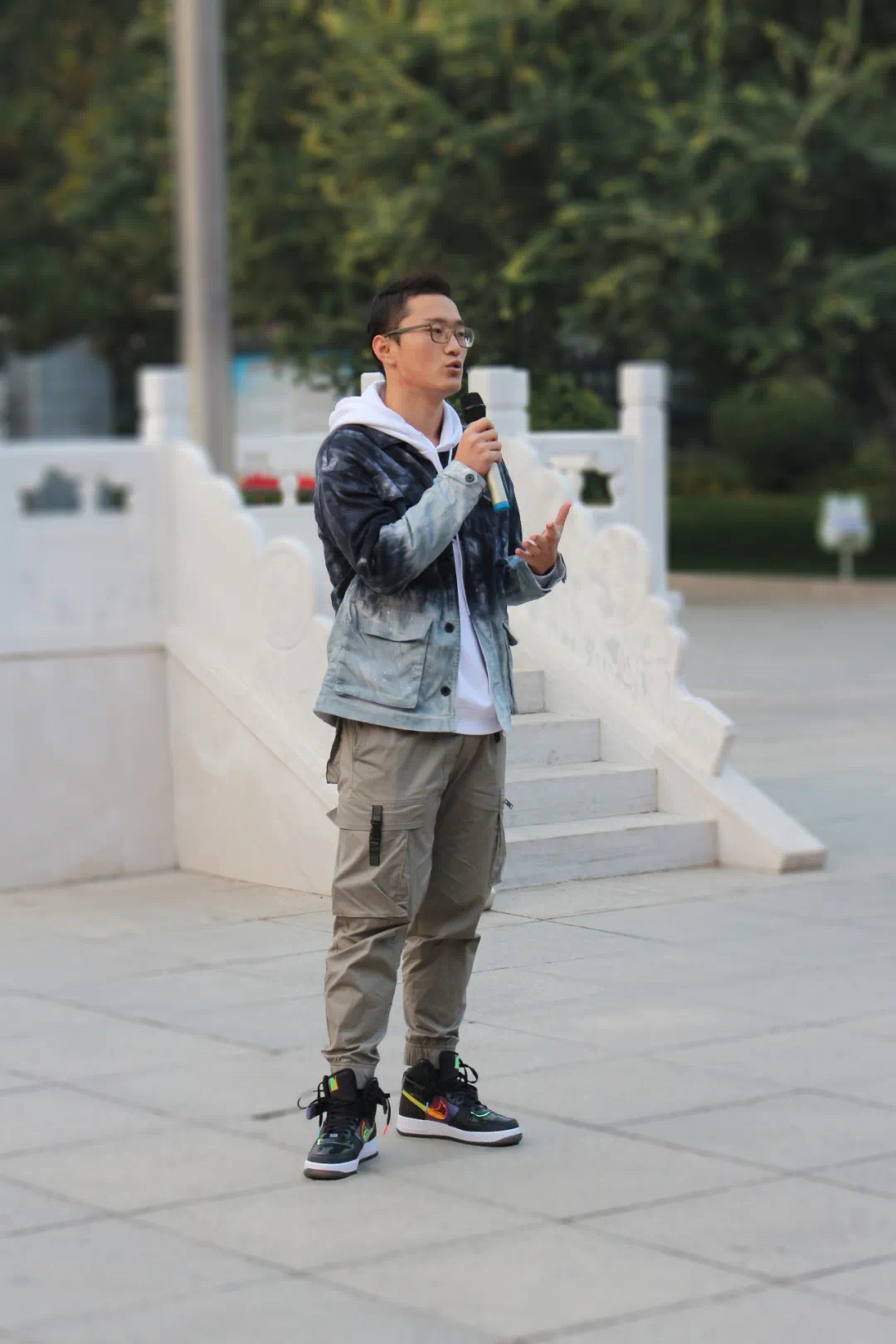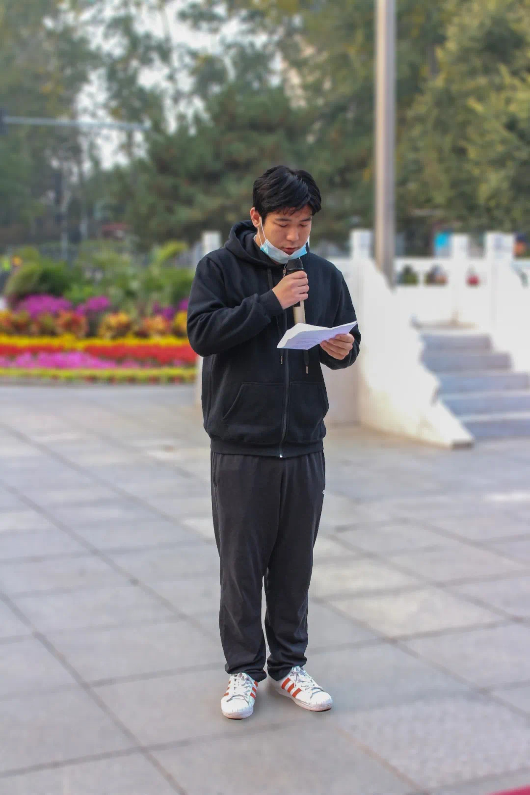 迎着晨光,国旗班同学们踏着矫健的步伐,护送国旗一路走来。他们飒爽的英姿,展现出了青年应有的朝气。在同学们的注目礼下,五星红旗冉冉升起。