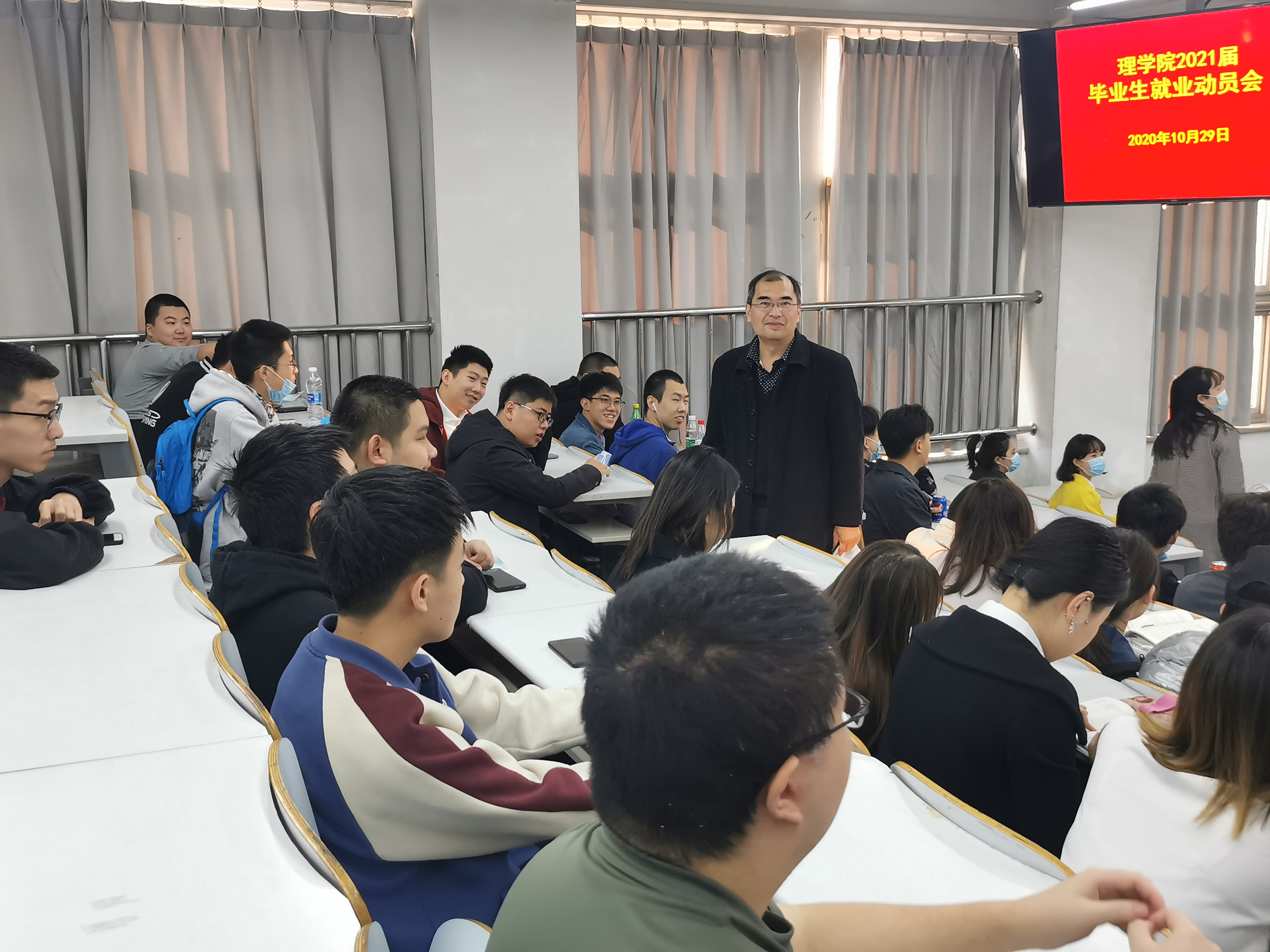 学院党委副书记李冱岸做了就业动员。李冱岸副书记向毕业生介绍了学院近几年就业情况,重点就当前疫情对就业可能带来的影响和同学们进行了交流。他要求同学们要树立正确的就业观,全体毕业生不管是考研、出国还是找工作,一定要结合自身实际情况,准确定位,积极就业。他希望考研的同学,在当前升学的黄金时间,要把握时机,奋力拼搏,从而实现自己的人生理想和目标,考上理想的学校;希望出国和找工作的同学,积极面对就业过程中遇到的挫折与困难,主动寻求老师的帮助,早日申请到理想学校,找到合适就业岗位。
