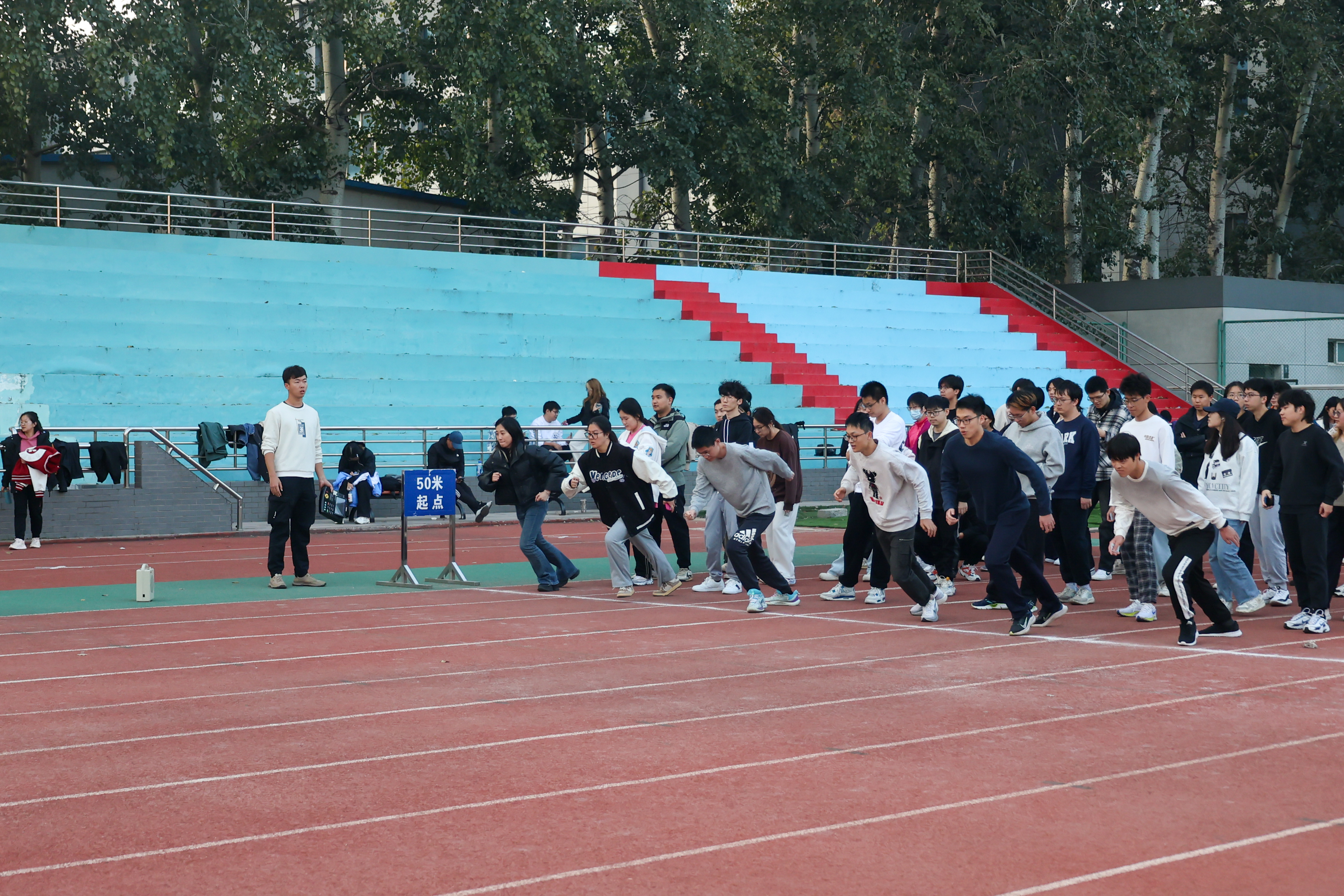 本次测试项目包括身高体重、肺活量、立定跳远、坐位体前屈、引体向上(男)、仰卧起坐(女)、50米、1000米(男)和800米(女)。测试工作启动以来,不断改善和优化体质健康测试流程,精心维护测试设备,确保测试工作的高效推进。测试过程中专门安排了志愿者进行测试引导,每个测试地点都安排有值班老师;测试前,带领学生们先进行热身,消除他们的紧张情绪,帮助进入最佳状态,防止出现运动损伤。