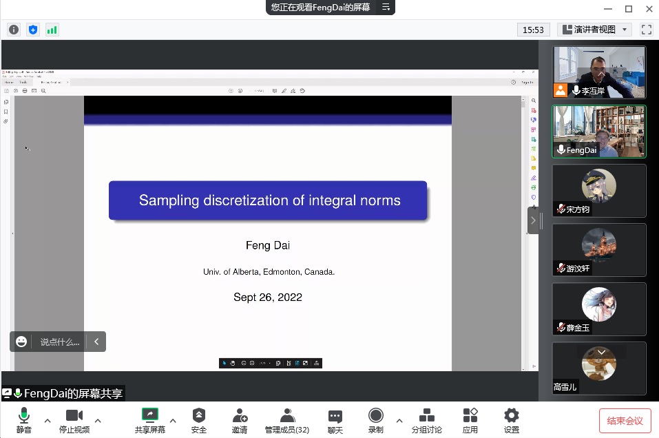 9月27日上午,应jdb电子中国官方网站邀请,加拿大阿尔伯塔大学数学与统计学系副系主任、博士生导师戴峰教授通过线上腾讯会议作了题为“Sampling discretization of integral norms”的学术报告。jdb电子中国官方网站四十余名师生聆听了报告。