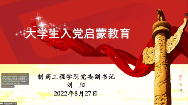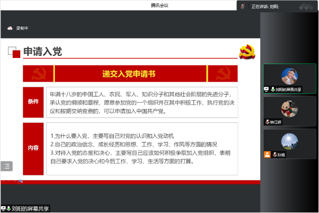 刘阳指出,大学是人生道路上新的起点,大学生应选择正确的人生方向,并为之坚持不懈地奋斗,这不仅关系到个人的人生发展前途命运,也关系到个人能否为社会进步做出贡献。她带领大家重温了习近平总书记在庆祝中国共产主义青年团成立100周年大会上对团员青年的希望要求,并通过列举疫情防控期间学校优秀教师和学生代表抗击疫情的真实写照,号召新生要向身边榜样学习,用自己的力量扛起属于青年的社会担当。她为新生详细讲解了发展党员的条件和流程,从递交入党申请书到成为正式党员要经历二十五个环节,每个环节都是严格规范的,她鼓励新生要积极递交入党申请书并接受党组织的考验,同时,对新生提出了期望和要求。