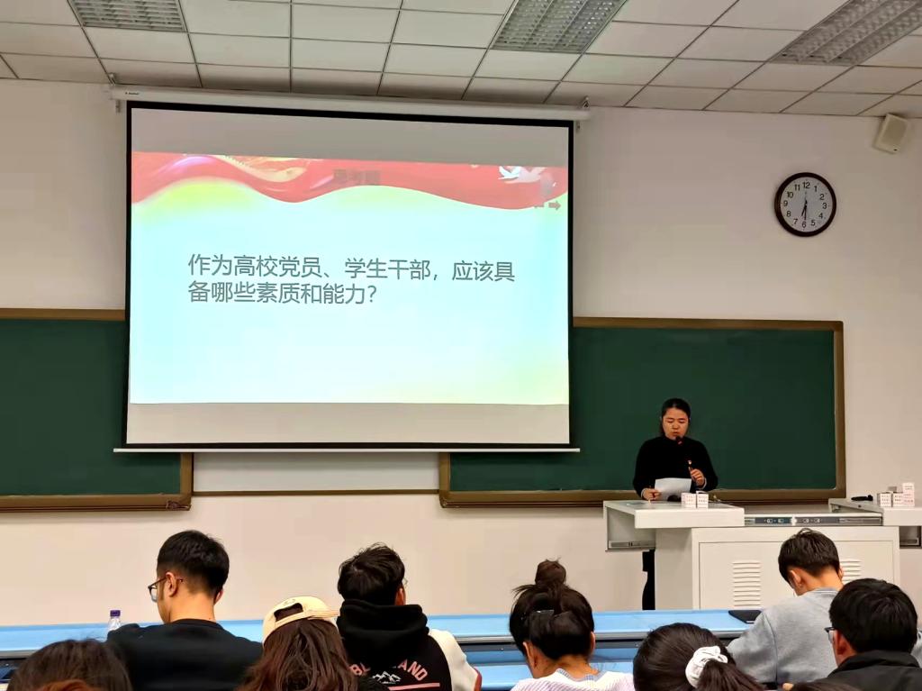 刘书记以“学习习近平在2021年秋季学期中央党校(国家行政学院)中青年干部培训班开班仪式上重要讲话”为主题,深入讲解了习近平总书记对青年干部提出的48字要求。她结合向警予同志的英雄事迹以及“洁洁良”事件的反思,有力诠释了信念坚定、对党忠诚的重大意义。她以本次活动为契机,对同学们提出三点希望和要求,一是要严格要求自己,以身作则,充分发挥先锋模范带头作用;二是要增强宗旨意识,积极担当作为,做好老师和同学间的桥梁和纽带;三是要珍惜光阴,不负韶华,勤学苦练,不断增强本领。