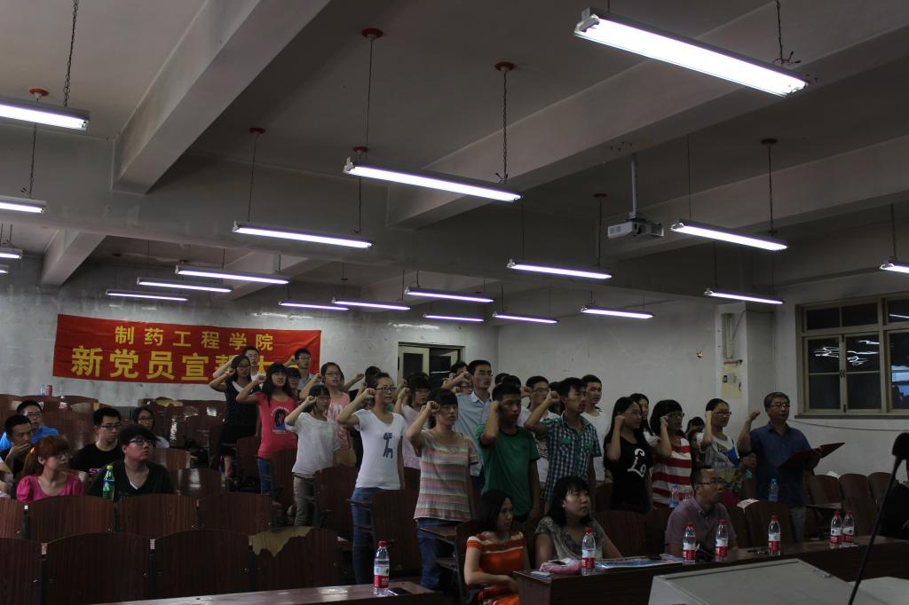 为了喜迎中国共产党建党九十三周年,进一步增强学生党员的党性意识,制药工程学分党委于7月1日中午,在四阶教室,隆重举行了新党员入党宣誓仪式。分党委副书记刘玉成,分党委组织委员、化学实验中心副主任赵翔,学院团委书记张雷以及各学生党支部书记出席了宣誓仪式;32名学生党员参加了仪式;仪式由分党委兼职组织员张达盼主持。